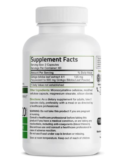 Ginkgo Biloba dianggap sebagai ramuan nootropik, karena telah digunakan selama ribuan tahun untuk mendukung fungsi kognitif secara alami. Ginkgo Biloba dari Bronson menyediakan 500 MG Daun Ginkgo Biloba per porsi untuk meningkatkan fokus, memori dan sirkulasi yang sehat.* Ginkgo dikatakan membantu meningkatkan aliran darah dan oksigen ke otak, yang membantu meningkatkan kinerja kognitif. Diuji di laboratorium dan bebas GMO, Gluten, dan Kedelai, Ginkgo Biloba 500 MG diproduksi dengan cermat oleh para profesional terlatih di fasilitas canggih kami yang berlokasi di Hauppauge, New York. Ginkgo Biloba 500 MG ramah Vegan/Vegetarian dan tidak mengandung bahan yang berasal dari hewan.