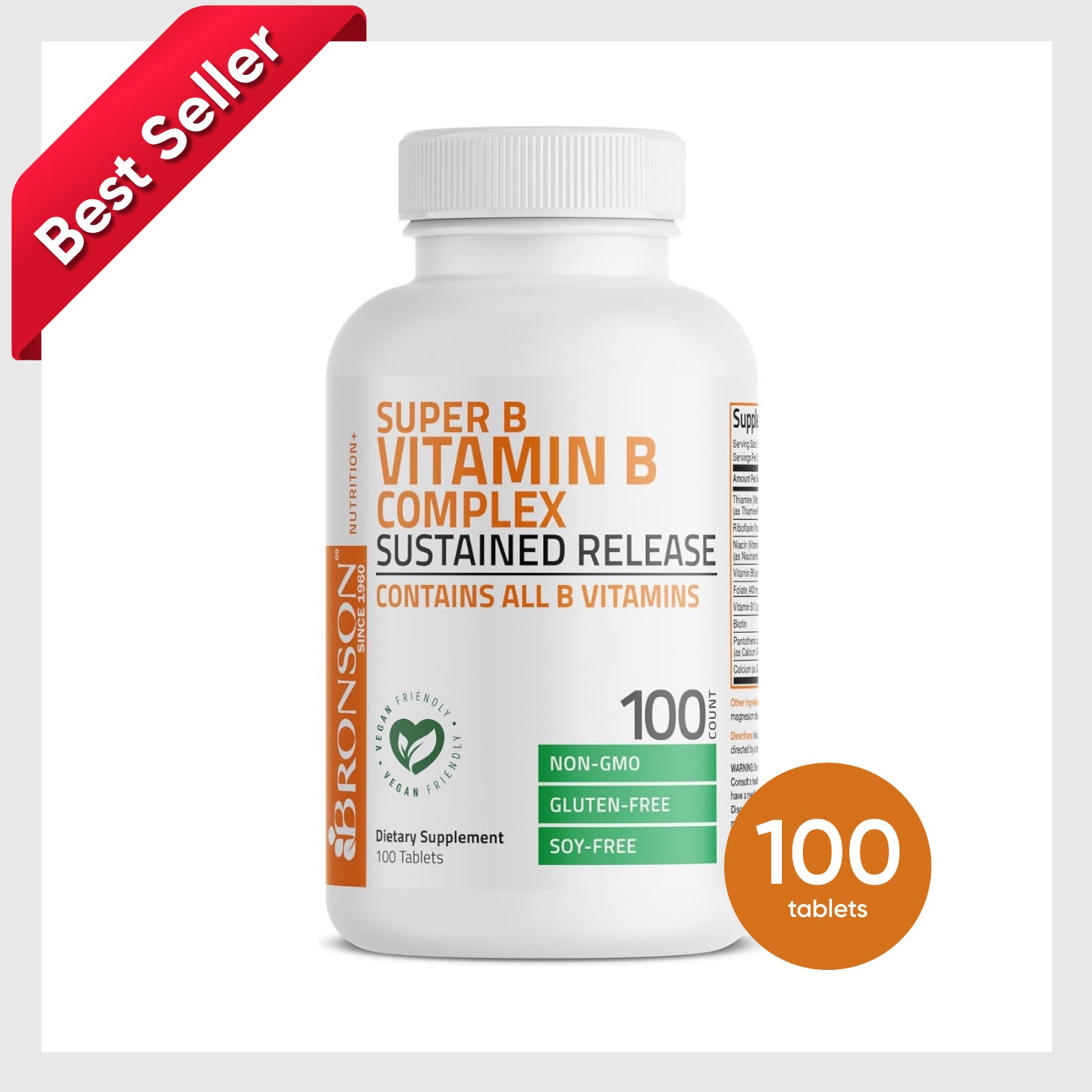 Bronson Super B Vitamin B Complex Sustained Slow Release (Vitamin B1, B2, B3, B6, B9 - Folic Acid, B12) Contains All B Vitamins 100 Tablets